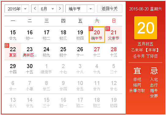 按照國務(wù)院辦公廳關(guān)于2015年部分節(jié)假日安排的通知,2015年端午節(jié)假期共3天,從6月20日至22日。其中,6月20日(星期六、農(nóng)歷端午當(dāng)日)為法定節(jié)假日,6月21日(星期天,屬于公休日)照常放假;6月22日(星期一)調(diào)休。
