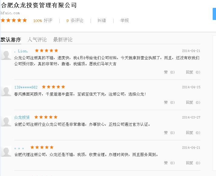 眾龍投資感謝合肥公司注冊老板們的支持與關心~感謝各位老板們的關心,對我公司作這么好的評價,感謝一路一直有您的陪伴,我們的宗旨:“盡我所能,滿足需求” 讓您放心,讓您滿意~以合法,合理,快速完成您的心愿!我們24H小時為您做任何解答~關注我們的服務地址http://koubei.baidu.com/s/www.ahgszc.com