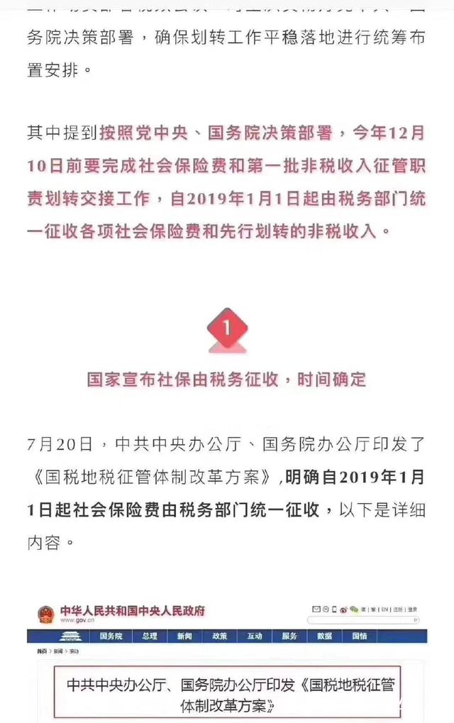 三: 已宣布自2019月1月1號起有稅務(wù)部門統(tǒng)一收各項(xiàng)社會保險(xiǎn)費(fèi)和先行劃轉(zhuǎn)的非稅收入。